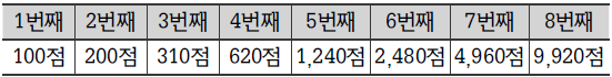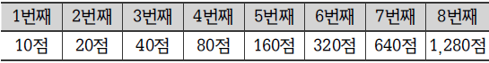 | ○ 체육대회에서 8개의 종목을 구성해 각 종목에서 우승 시 얻는 승점을 합하여 각 팀의 최종 순위를 매기고자 한다. ○ 각 종목은 순서대로 진행하고, 3번째 종목부터는 각 종목 우승 시 받는 승점이 그 이전 종목들의 승점을 모두 합한 점수보다 10점 더 많도록 구성하였다. |