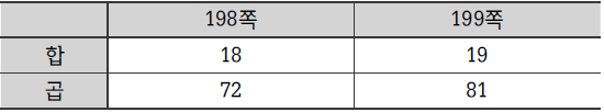 • 乙이 198쪽과 199쪽을 펼친 경우, 각 자리 숫자의 합과 곱은 다음과 같다.