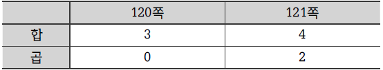 • 甲이 120쪽과 121쪽을 펼친 경우, 각 자리 숫자의 합과 곱은 다음과 같다.