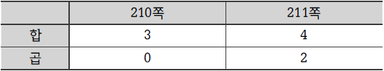 • 乙이 210쪽과 211쪽을 펼친 경우, 각 자리 숫자의 합과 곱은 다음과 같다.
