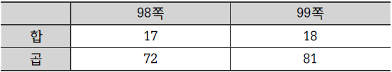 • 甲이 98쪽과 99쪽을 펼친 경우, 각 자리 숫자의 합과 곱은 다음과 같다.