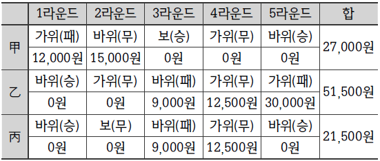 이에 따라 甲, 乙, 丙이 무승부가 된다. 네 번째 동그라미에 따라 3라운드 승자인 甲은 음식값을 지불하지 않는다. 다섯 번째 동그라미에 따라 4라운드에서는 乙과 丙이 25,000원을 동일한 비율로 나눈 12,500원씩 음식값을 지불한다.