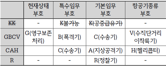 ⑤ (현재상태부호)(특수임무부호)(항공기종류부호)-(설계번호)(개량형부호)