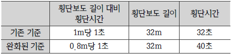 어린이, 장애인 등 보행약자의 이동이 많아 배려가 필요한 장소에 설치된 횡단보도의 경우에는 ‘1m당 1초’보다 완화된 기준을 적용함을 확인할 수 있다. 32m 길이 횡단보도의 보행시간이 47초인 경우에도 보행진입시간은 일정하므로 7초이다. 그러므로 나머지 40초가 횡단시간이 된다. 따라서 ㉡는 0.8m가 된다.