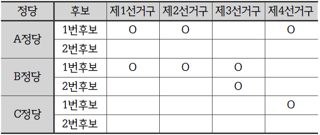 ○○국의 의회의원선거 제1~4선거구의 선거 결과를 요약하면 다음과 같다. 수치는 선거구별 득표율(%)이다.![]() |