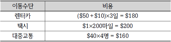 | 렌터카 | (렌트비+유류비)×이용 일수 -렌트비=$50/1일(4인승 차량) -유류비=$10/1일(4인승 차량) |