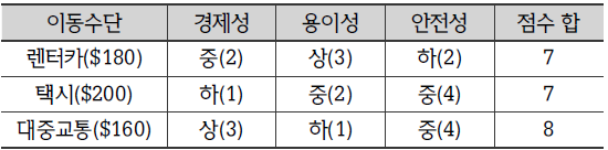 4명으로 구성된 A팀은 해외출장을 계획하고 있다. A팀은 출장지에서의 이동수단 한 가지를 결정하려 한다. 이 때 A팀은 경제성, 용이성, 안전성의 총 3가지 요소를 고려하여 최종점수가 가장 높은 이동수단을 선택한다.