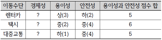 | 이동수단 | 경제성 | 용이성 | 안전성 |