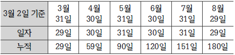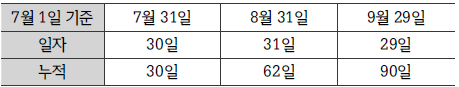 8월 1일을 기준으로 하여 우선 8월 31일에 해당하는 일수인 30일을 더한다. 이후에는 9월에 해당하는 30일, 10월 30일까지 반영하면 8월 1일부터 10월 30일까지 총 90일이 된다.