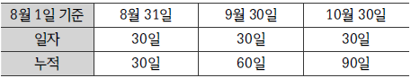8월 1일을 기준으로 하여 우선 8월 31일에 해당하는 일수인 30일을 더한다. 이후에는 9월에 해당하는 30일, 10월 30일까지 반영하면 8월 1일부터 10월 30일까지 총 90일이 된다.