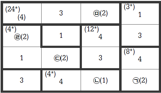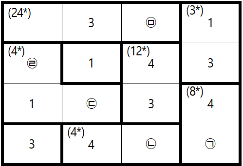 ‘(24*)’구획을 구성하는 셀에 지정된 숫자를 모두 곱하면 24가 된다는 의미이다. 1, 2, 3, 4 서로 다른 숫자를 곱하여 24가 되는 3개의 숫자는 2, 3, 4밖에 없으므로 위의 셀 안에는 2, 3, 4가 각각 하나씩 들어가야 한다.