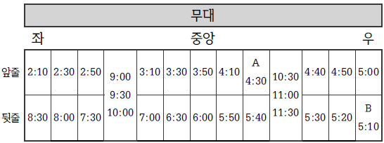 ② 공연일 오전 9:00부터 공연일 오전 10:00까지 도착한 관람객은 모두 좌측 계단에 앉는다.