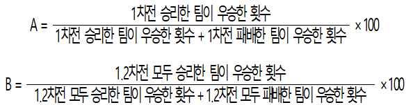 | ㄱ. A를 구하는 계산식의 분모는 20이다. ㄴ. A와 B 모두 50보다 작을 수는 없다. ㄷ. A>B가 될 수는 없다. ㄹ. △△일보 기사에 따르면, 1․2차전을 모두 패배한 팀의 우승확률은 (100-B)%이다. |