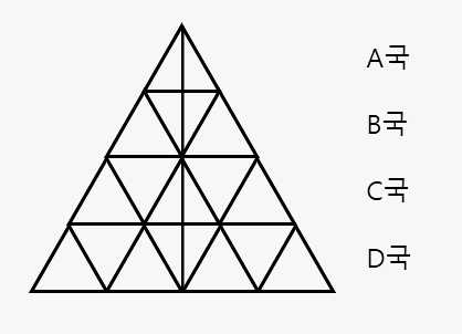 위 도형에 따르면, A국의 면적은 작은 정삼각형 1개 크기이며, B국은 3개, C국은 5개, D국은 7개 크기임을 알 수 있다. 모든 국가의 쌀 생산량은 영토의 면적에 비례하며, A국의 영토에서는 매년 10,000가마의 쌀이 생산되므로, B국의 영토에서는 30,000가마, C국의 영토에서는 50,000가마, D국의 영토에서는 70,000가마가 생산된다.