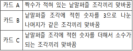 ㄴ. (X) ‘경세유표’라는 단어를 만들기 위해서는 1과 5, 2와 8을 맞바꿔야 한다. 그런데 카드 A로 2와 8은 맞바꿀 수 있지만, 1과 5는 더하면 6이 되므로 소수가 되지 못한다. 따라서 카드 C로 낱말퍼즐 조각 2개를 맞바꿀 수 없다. 다른 경우를 고려해 보더라도 낱말퍼즐 조각을 3개 이상 맞바꿔야 하는데 카드는 2장뿐이므로 불가능하다.