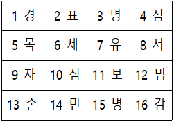 ○ 이 게임은 카드를 뽑아 낱말퍼즐 조각끼리 맞바꿔 단어를 만드는 게임이다. 낱말퍼즐은 총 16조각으로 이루어져 있고, 다음과 같이 1조각당 숫자 1개와 문자 1개가 함께 적혀 있다.![]() ○ 카드는 A, B, C 각 1장씩 있고, 뽑힌 각 1장의 카드로 낱말퍼즐 조각 2개를 아래와 같은 방식으로 1회 맞바꿀 수 있다. ![]() ○ 낱말퍼즐에서 같은 가로 줄에 있는 4개의 문자를 왼쪽에서부터 차례로 읽은 것 또는 같은 세로 줄에 있는 4개의 문자를 위쪽에서부터 차례로 읽은 것을 ‘단어’라고 한다. |