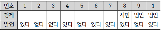 | ○ 9명의 참가자는 1번부터 9번까지의 번호 중 하나를 부여 받고, 동시에 제비를 뽑아 3명은 범인, 6명은 시민이 된다. ○ ‘1번의 오른쪽은 2번, 2번의 오른쪽은 3번, …, 8번의 오른쪽은 9번, 9번의 오른쪽은 1번’과 같이 번호 순서대로 동그랗게 앉는다. ○ 참가자는 본인과 바로 양 옆에 앉은 사람이 범인인지 시민인지 알 수 있다. ○ “옆에 범인이 있다”라는 말은 바로 양 옆에 앉은 2명 중 1명 혹은 2명이 범인이라는 뜻이다. ○ “옆에 범인이 없다”라는 말은 바로 양 옆에 앉은 2명 모두 범인이 아니라는 뜻이다. ○ 범인은 거짓말만 하고, 시민은 참말만 한다. |