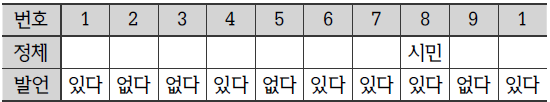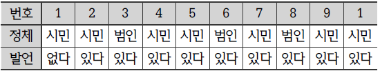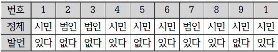 | ○ 9명의 참가자는 1번부터 9번까지의 번호 중 하나를 부여 받고, 동시에 제비를 뽑아 3명은 범인, 6명은 시민이 된다. ○ ‘1번의 오른쪽은 2번, 2번의 오른쪽은 3번, …, 8번의 오른쪽은 9번, 9번의 오른쪽은 1번’과 같이 번호 순서대로 동그랗게 앉는다. ○ 참가자는 본인과 바로 양 옆에 앉은 사람이 범인인지 시민인지 알 수 있다. ○ “옆에 범인이 있다”라는 말은 바로 양 옆에 앉은 2명 중 1명 혹은 2명이 범인이라는 뜻이다. ○ “옆에 범인이 없다”라는 말은 바로 양 옆에 앉은 2명 모두 범인이 아니라는 뜻이다. ○ 범인은 거짓말만 하고, 시민은 참말만 한다. |