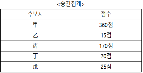 | ‘올해의 체육인상’ 후보에 총 5명(甲~戊)이 올랐다. 수상자는 120명의 기자단 투표에 의해 결정되며 투표규칙은 다음과 같다. ○ 투표권자는 한 명당 한 장의 투표용지를 받고, 그 투표용지에 1순위와 2순위 각 한 명의 후보자를 적어야 한다. ○ 투표권자는 1순위와 2순위로 동일한 후보자를 적을 수 없다. ○ 투표용지에 1순위로 적힌 후보자에게는 5점이, 2순위로 적힌 후보자에게는 3점이 부여된다. ○ ‘올해의 체육인상’은 개표 완료 후, 총 점수가 가장 높은 후보자가 수상하게 된다. ○ 기권표와 무효표는 없다. 현재 투표까지의 중간집계 점수는 아래와 같다. ![]() |