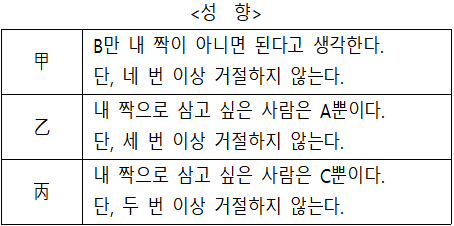 따라서 丙이 거절했을 당시 甲의 짝 후보는 C이었을 것이다.