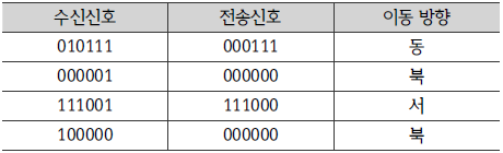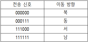수신 신호 000001에서 바뀐 숫자는 전송 신호를 고려할 때 여섯 번째 숫자인 1임을 파악할 수 있다. 그러므로 수신 신호 000001의 전송 신호는 000000이 되고 이동 방향은 북쪽이다.