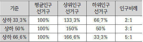 그러나 평균인구 100%를 기준으로 평균인구 기준 상하 66.6%는 상위인구 166.6%가 상한선, 하위인구 33.3%가 하한선이 되어 인구비례 5:1이 된다.