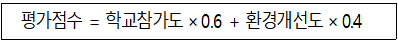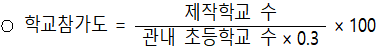 | 가. 아동안전지도 제작은 학교 주변의 위험․안전환경 요인을 초등학생들이 직접 조사하여 지도화하는 체험교육과정이다. 관할행정청은 각 시․도 관내 초등학교의 30% 이상이 아동안전지도를 제작하도록 권장하는 사업을 실시하고 있다. 나. 각 초등학교는 1개의 아동안전지도를 제작하며, 이 지도를 활용하여 학교 주변의 위험환경을 개선한 경우 ‘환경개선학교’로 등록된다. 다. 1년 동안의 아동안전지도 제작 사업을 평가하기 위한 평가점수 산식은 다음과 같다. ※단, 학교참가도가 100을 초과하는 경우 100으로 간주 |