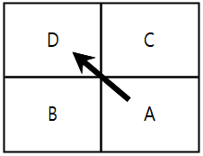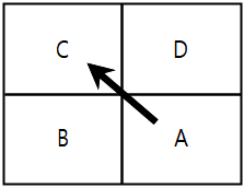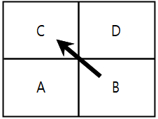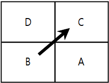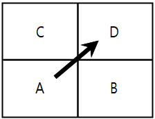 | ○ 甲팀(A․B)과 乙팀(C․D)간 복식 경기 진행 ○ 3:3 동점 상황에서 A가 C에 서브하고 甲팀(A․B)이 1점 득점 ![]() |