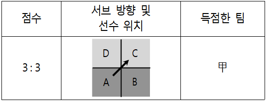 문제 다음 <배드민턴 복식 경기방식>을 따를 때, <경기상황>에 이어질 서브 방향 및 선수 위치로 가능한 것은? <배드민턴 복식 경기방식> ○ 점수를 획득한 팀이 서브권을 갖는다. 다만 서브권이