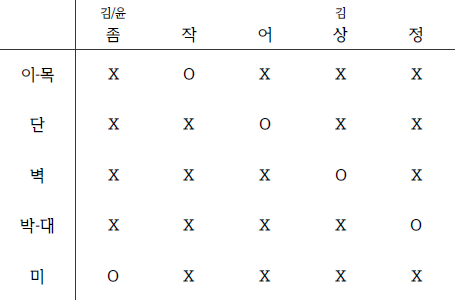 | ○ 일꾼 다섯 명의 이름은 좀쇠, 작은놈, 어인놈, 상득, 정월쇠이다. ○ 다섯 일꾼 중 김씨가 2명, 이씨가 1명, 박씨가 1명, 윤씨가 1명이다. ○ 이들의 직업은 각각 목수, 단청공, 벽돌공, 대장장이, 미장공이다. ○ 일당으로 목수와 미장공은 4전 2푼을 받고, 단청공과 벽돌공, 대장장이는 2전 5푼을 받는다. ○ 윤씨는 4일, 박씨는 6일, 김씨 두 명은 각각 4일, 이씨는 3일 동안 동원되었다. 동원되었지만 일을 하지 못한 날에는 보통의 일당 대신 1전을 받는다. ○ 박씨와 윤씨는 동원된 날 중 각각 하루씩은 배가 아파 일을 하지 못했다. ○ 목수는 이씨이다. ○ 좀쇠는 박씨도 이씨도 아니다. ○ 어인놈은 단청공이다. ○ 대장장이와 미장공은 김씨가 아니다. ○ 정월쇠의 일당은 2전 5푼이다. ○ 상득은 김씨이다. ○ 윤씨는 대장장이가 아니다. |