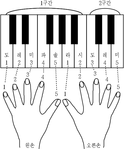 | 1~2구간의 흰 건반 10개만을 사용하여 ‘비행기’와 ‘학교종’ 두 곡을 연주한다. 왼손과 오른손을 나란히 놓고, 엄지, 검지, 중지, 약지, 새끼 다섯 종류의 손가락을 사용한다. 손가락 번호와 일치하는 건반 한 개만 칠 수 있으며, 각 노래에 사용되는 음은 아래와 같다. ○ 비행기: 한 구간 내의 ‘도, 레, 미’ 음만 사용 ○ 학교종: 한 구간 내의 ‘도, 레, 미, 솔, 라’ 음만 사용 ![]() |
