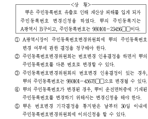 신청인의 번호를 변경할 경우 제3항 각 호의 기준에 따라야 하는데, 제1호에 따르면 번호의 앞 6자리(생년월일) 및 뒤 7자리 중 첫째 자리는 변경할 수 없다. 따라서 선지처럼 첫째 자리를 2에서 4로 바꾸는 것은 허용되지 않는다.