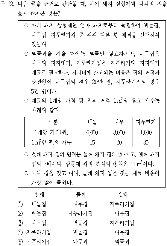 문제 다음 글을 근거로 판단할 때, 아기 돼지 삼형제와 각각의 집을 옳게 짝지은 것은? ○ 아기 돼지 삼형제는 엄마 돼지로부터 독립하여 벽돌집, 나무집, 지푸라기집 중 각각 다른 한 채씩을 선