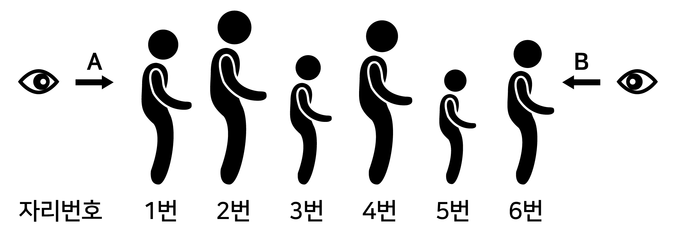 키가 서로 다른 6명의 어린이를 다음 그림과 같이 한 방향을 바라보도록 일렬로 세우려고 한다. 그림은 일렬로 세운 하나의 예이다. 한 어린이(이하 이라 한다)의 등 뒤에 보다 키가 큰 어린이가 1명이라도 있으면 A방향에서 의 뒤통수는 보이지 않고, 1명도 없으면 A방향에서  뒤통수는 보인다. 반대로 의 앞에 보다 키가 큰 어린이가 1명이라도 있으면 B방향에서 의 얼굴은 보이지 않고, 1명도 없으면 B방향에서 의 얼굴은 보인다.