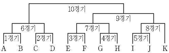 ○ △△배 씨름대회는 아래와 같은 대진표에 따라 진행되며, 11명의 참가자는 추첨을 통해 동일한 확률로 A부터 K까지의 자리 중에서 하나를 배정받아 대회에 참가한다.![]() ○ 대회는 첫째 날에 1경기부터 시작되어 10경기까지 순서대로 매일 하루에 한 경기씩 쉬는 날 없이 진행되며, 매 경기에서는 무승부 없이 승자와 패자가 가려진다. ○ 각 경기를 거듭할 때마다 패자는 제외시키면서 승자끼리 겨루어 최후에 남은 두 참가자 간에 우승을 가리는 승자 진출전 방식으로 대회를 진행한다. |