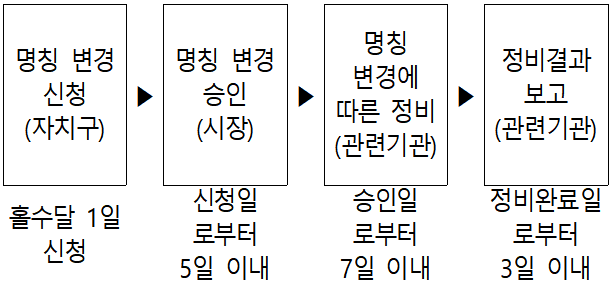 | □ 정류소 명칭 부여기준 ○ 글자 수: 15자 이내로 제한 ○ 명칭 수: 2개 이내로 제한 - 정류소 명칭은 지역대표성 명칭을 우선으로 부여 - 2개를 병기할 경우 우선순위대로 하되, ˙으로 구분 ![]() □ 정류소 명칭 변경 절차 ○ 자치구에서 명칭 부여기준에 맞게 홀수달 1일에 신청 - 홀수달 1일에 하지 않은 신청은 그 다음 홀수달 1일 신청으로 간주 ○ 부여기준에 적합한지를 판단하여 시장이 승인 여부를 결정 ○ 관련기관은 정류소 명칭 변경에 따른 정비를 수행 ○ 관련기관은 정비결과를 시장에게 보고 ![]() |