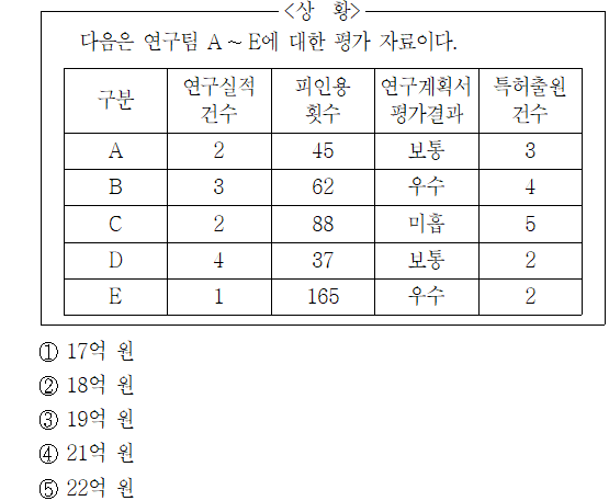 문제 해설 ▷ 정답 ① 항목별 점수와 그 합계를 구하면 다음과 같다. 합계 점수 상위 순으로 B, D, E가 해당하지만, E는 79점으로 합계 점수가 80점 미만이어서 선정에서 제외한다. 1위인 B는 연구계